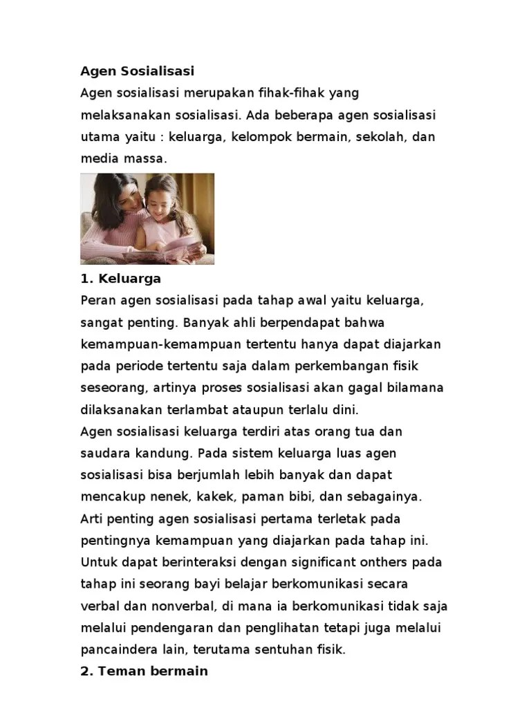 We are a sharing community. So please help us by uploading 1 new document or like us to download Tempat atau kelompok tertentu bertanggung jawab atas terjadinya interaksi sosial. Puncak pengaruh teman bermain adalah pada masa remaja. Belajar dalam hal ini adalah mempelajari segala hal di sekitar kita dan menanamkan nilai dan norma pada diri individu. Keluarga termasuk di dalamnya kedua orang tua dan anggota keluarga inti. Kelompok bermain lebih banyak berperan dalam membentuk kepribadian seorang individu. Agen sosialisasi politik dapat diartikan sebagai proses pembentukan sikap dan orientasi politik dari para anggota masyarakat dalam menjalani kehidupan sosial politik. Ada empat agen sosialisasi yang utama keluarga, kelompok bermain, media massa , dan lembaga pendidikan sekolah. Kelompok bermain lebih banyak berperan dalam membentuk kepribadian seorang individu. Please fill this form, we will try to respond as soon as possible. Dalam sosialisasi ini, seseorang akan diajarkan saat memasuki tahap kedewasaan, seorang remaja akan berusaha memposisikan diri dalam lingkungan masyarakat dengan kepribadian yang dimilikinya. Jacobs, mengidentifikasikan empat agen sosialisasi utama, yaitu keluarga, kelompok bermain, media massa, dan pendidikan (sekolah).